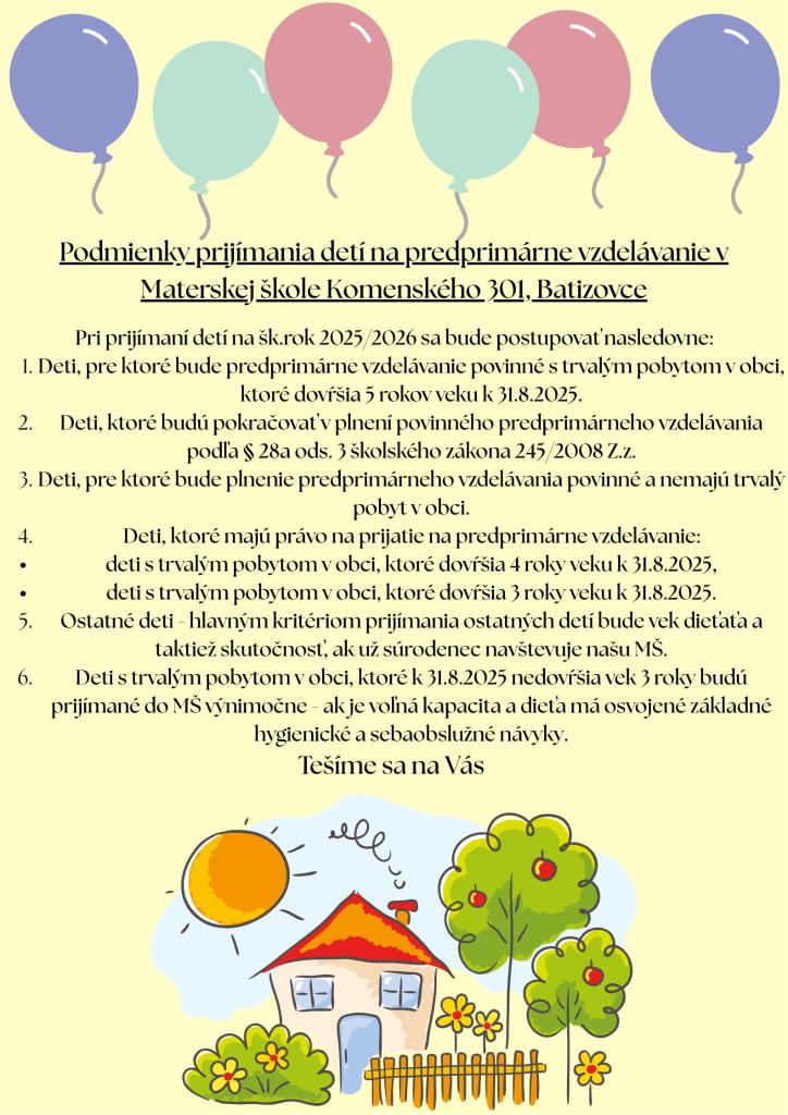 Podmienky prijímania detí na predprimárne vzdelávanie v Materskej škole Komenského 301 Batizovce: