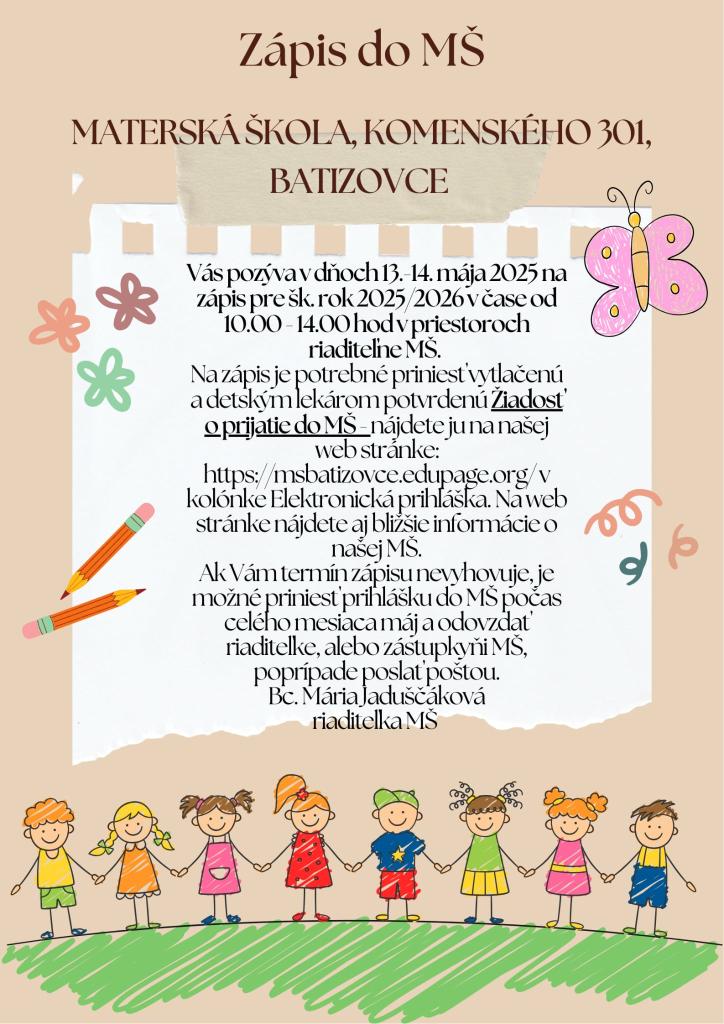 Na zápis je potrebné priniesť vytlačenú a všeobecným detským lekárom potvrdenú Žiadosť o prijatie do MŠ, ktorú nájdete na web stránke našej MŠ https://msbatizovce.edupage.org/register/ v kolónke Elektronická prihláška.