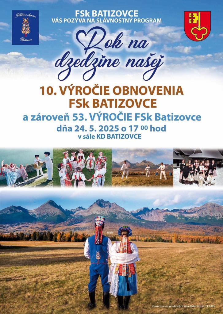 FSk Batizovce Vás srdečne pozýva na slávnostný program " Rok na dzedzine našej", pri príležitosti 10.výročia obnovenia FSk Batizovce a zároveň 53. výročia jej vzniku. Príďte si užiť krásu nášho folklóru 24.5.2025 o 17:00 hod v sále kultúrneho domu.